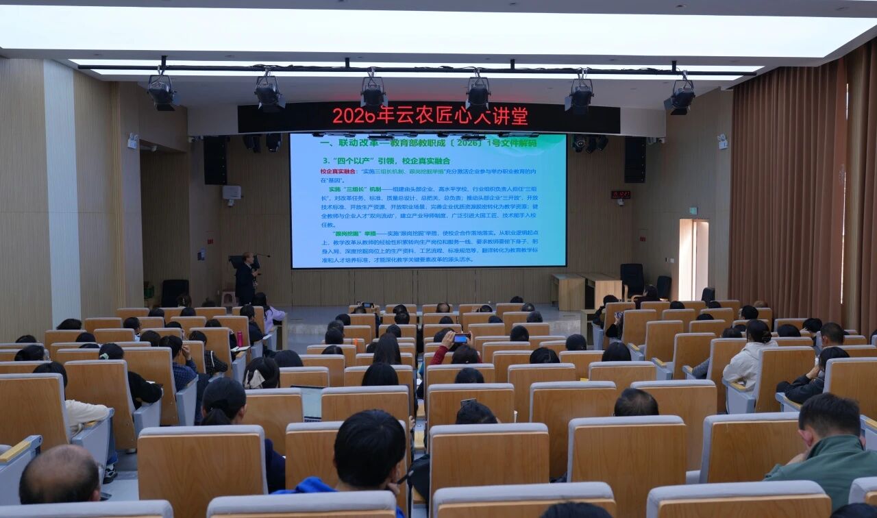 通知中心为全面落实省级“双高”学校建设各项任务,纵深推进职业教育内涵式改革,加快推动学校高质量发展步伐,3月18日下午,由科研产业处主办,农学与园艺技术学院、教务处承办的2026年“云农匠心”大讲堂2026年第一期、第二期在小哨校区综合楼阶梯教室开讲。本轮讲座聚焦职业教育国际先进经验借鉴与课程教材改革两大主题,统筹部署学校双高建设重点工作,为学校打造高水平农业职业院校、培育高素质技术技能人才指明方向、明晰路径。