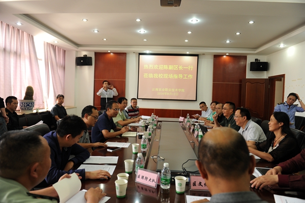2016年8月12日下午4:00,五华区人民政府副区长陈净一行到我校茭菱校区调研。调研会在我校茭菱校区行政楼四楼会议室召开,党委副书记、纪委书记季佳元主持会议。