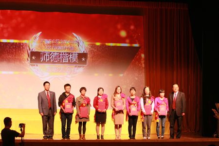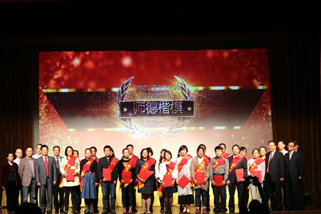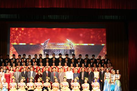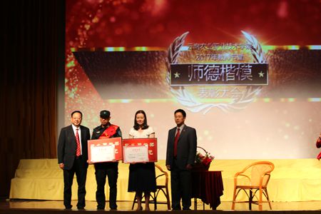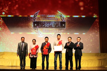 学院领导在大会上为荣获学院第一届“师德楷模”称号的7位任课教师、5位辅导员(班主任)、3位管理干部,以及获得师德楷模提名奖的27位老师颁奖。颁奖仪式上播放了学院宣传部策划,梁宇老师制作的三段视频,特别对有着最美微笑的任课教师施忠芬老师,见义勇为、勇救落水大学生的班主任邓启玲老师,在平凡的食堂岗位上做着不平凡业绩的王佳宾老师进行生动展示,博得观众强烈的共鸣。大会还由党委书记崔金赋、院长文俊老师向2017年6月4日见义勇为事件中,展现高尚道德的邓启玲老师和学校保安何本云同志,颁发特别荣誉奖及奖金。