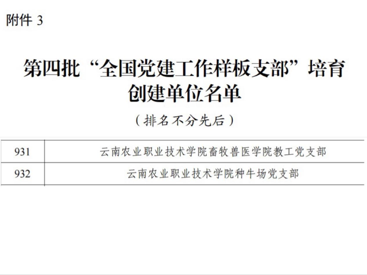 通知中心近日,教育部公布第四批新时代高校党建示范创建和质量创优工作遴选结果,我校畜牧兽医学院教工党支部、种牛场党支部入选“全国党建工作样板支部”培育创建单位,实现党建工作新突破。