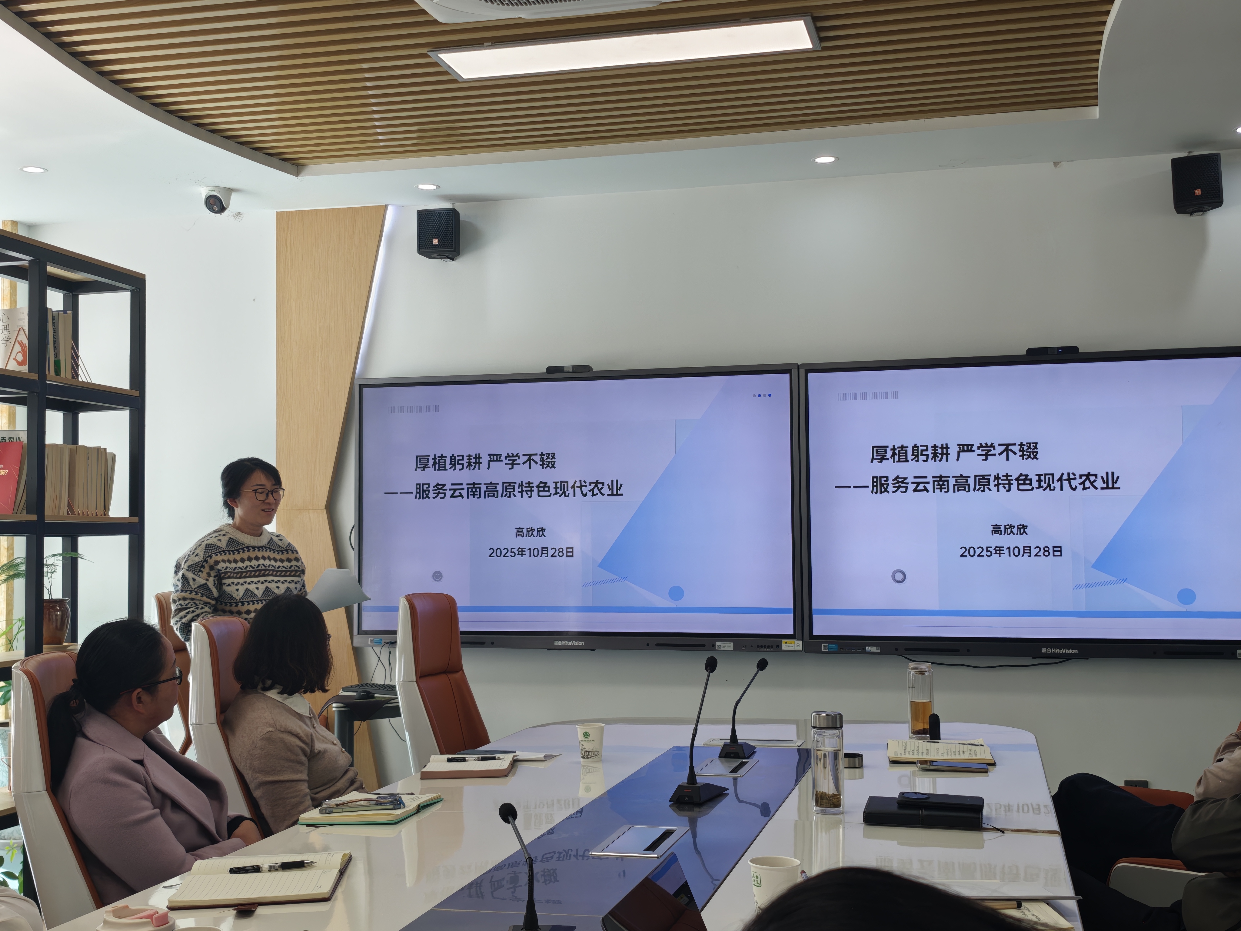 汇报环节,三位教师从不同角度对专业建设进行了思考与分享。文霞老师以《关于我校专业群建设工作的几点思考》为题,系统梳理国家职业教育专业群建设政策演进脉络,从“提升业务水平、完善管理机制、动态调整专业结构”三方面提出后续优化路径,为学院专业群对接区域农业产业链、强化产教融合提供清晰思路。陈巧老师以《锚定专业建设目标,深耕金课内涵打造》为题,结合职业教育“五金”建设背景,针对当前课程开发困境,提出“完善校企协同机制、强化双师型队伍建设、推进数字化教学改革”等解决方案,为学院优化课程体系、提升课堂教学质量提供实践指引。高欣欣老师以《厚植躬耕,严学不缀——服务云南高原特色现代农业》为题,结合现代农业产业转型升级需求,从“培养目标定位、课程体系优化、实践教学强化、思政元素融入”四个维度,阐述现代农业技术专业人才培养方案修订的必要性与具体方向。