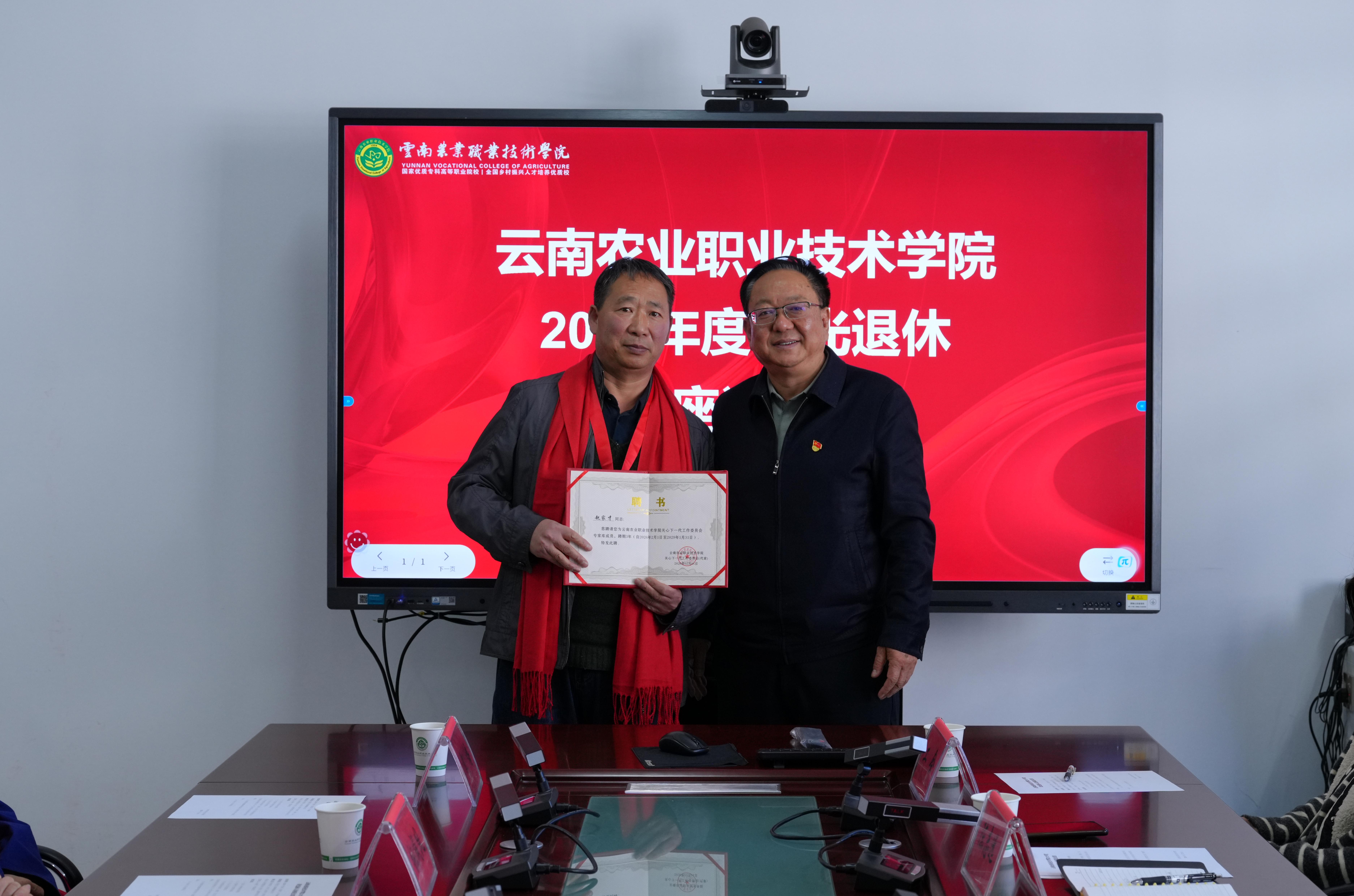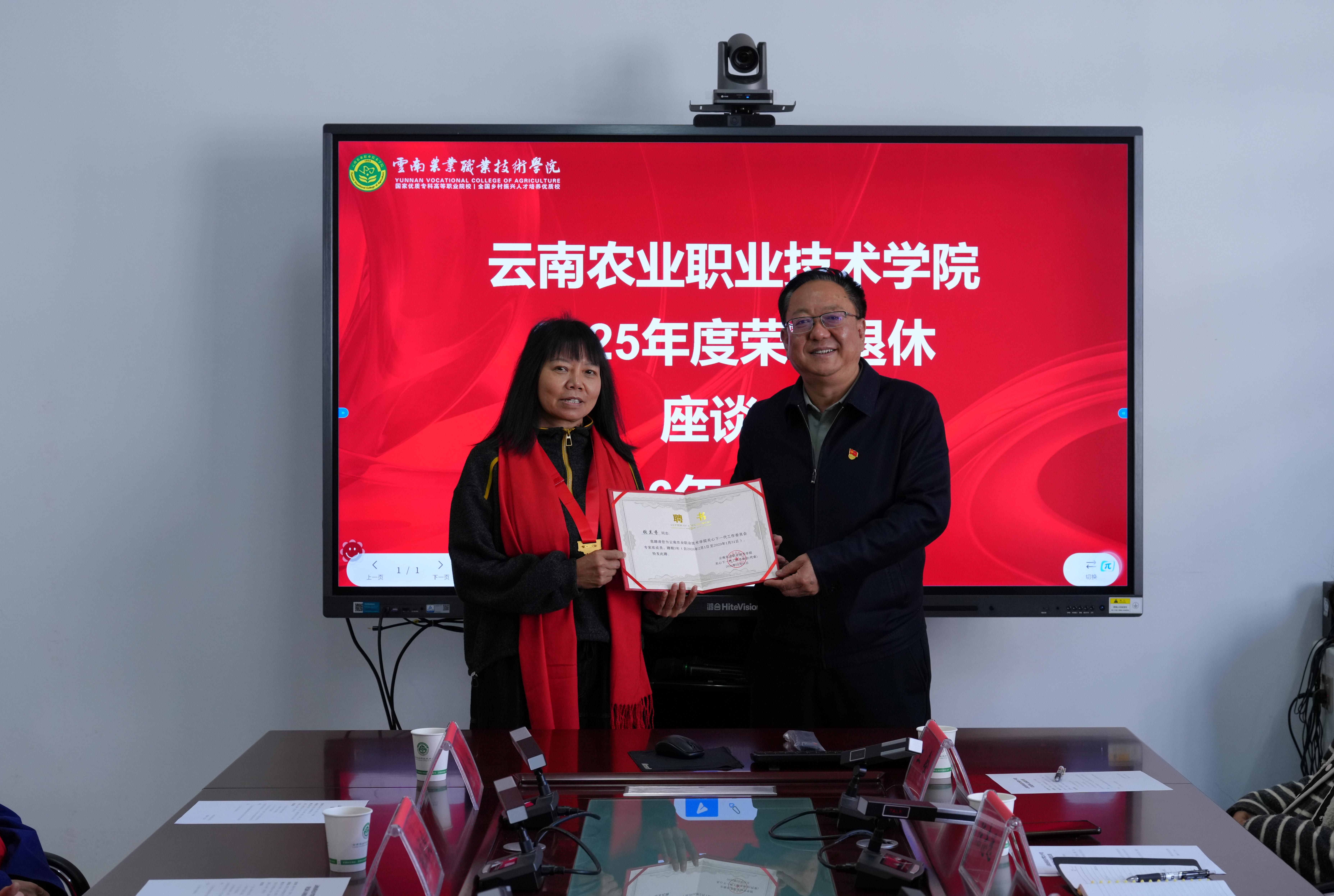 会议现场举行了简朴而庄重的聘书及纪念章颁发仪式。文俊书记为李春平、赵家才、张兰芬三位同志颁发云南农业职业技术学院关心下一代工作委员会专家组成员和宣讲员聘书,依托学校关工委平台,希望老同志们发挥优势、持续发光发热,助力培养知农爱农新型人才。