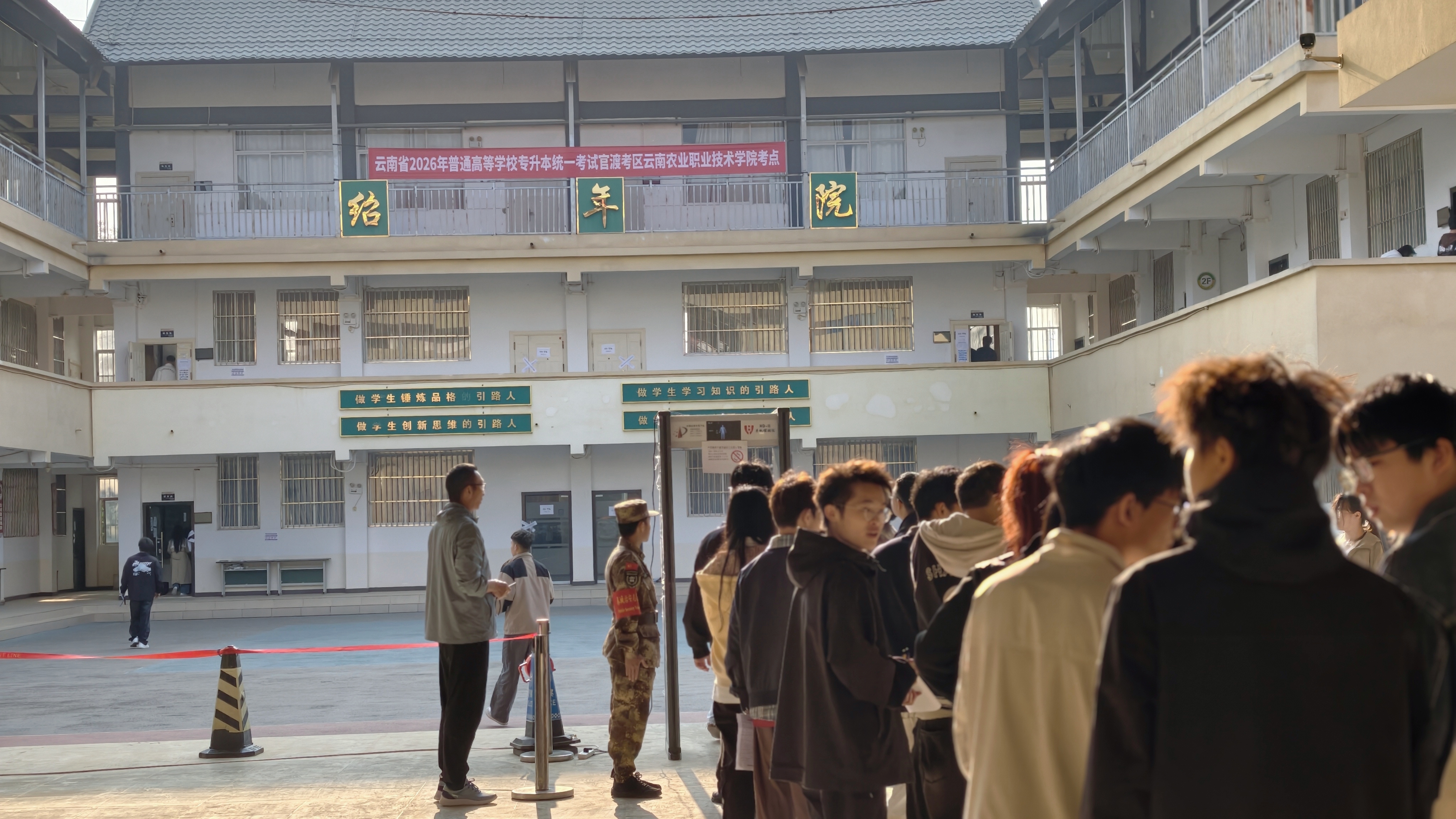 考试期间,两个考点严格执行全省考务工作规范,严把身份核验、安全检查、考场管理等关键关口。学校坚持 “以考生为中心”,同步强化全程监督与暖心服务。身着马甲的志愿者穿梭考点,为考生指引考场、答疑解惑;安保人员坚守岗位,引导考生有序入场,守护考试秩序;考点示意图清晰明了,手机集中保管点、考生服务点等标识醒目;医疗保障人员随时待命,食堂工作人员精心准备餐食,各部门联动配合,快速响应并规范处置电力、设备、考生身体不适等突发情况,从细微处传递关怀,让考生感受到温暖,形成全方位、无缝隙的保障闭环。