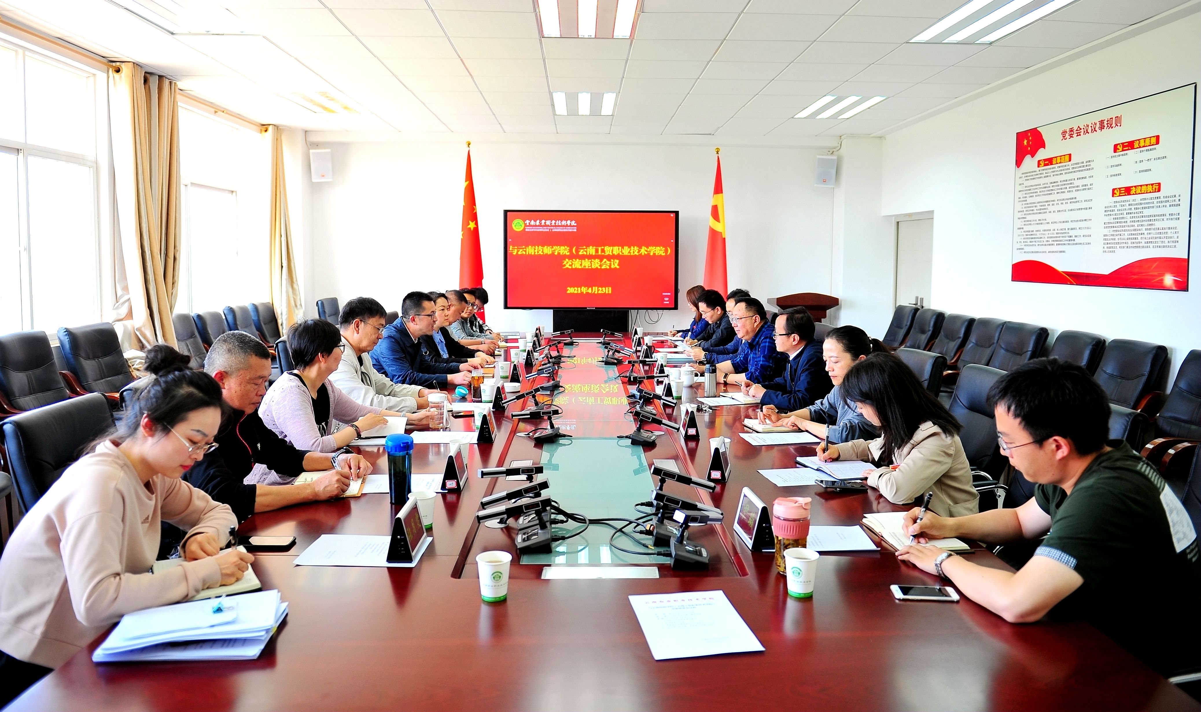 通知中心4月23日上午,云南技师学院(云南工贸职业技术学院)党委副书记、院长张泽斌一行9人到我院交流座谈。我院党委副书记、院长文俊和纪委书记冯志宏出席了会议,办公室(党委巡察办)、党委宣传部、学生处和纪检处等相关部门人员参加了会议。会议由冯志宏同志主持。