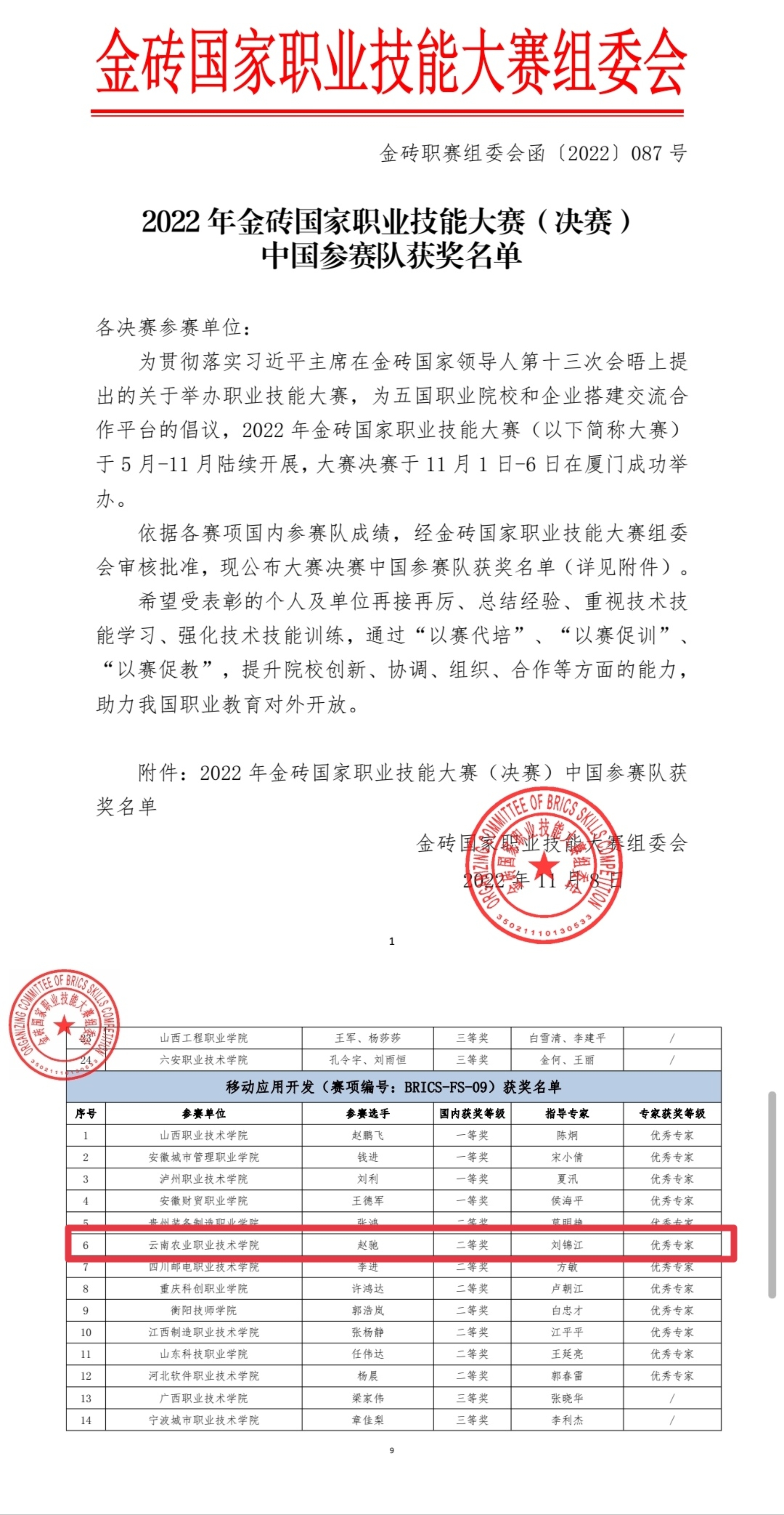 通知中心11月6日,在2022年金砖国家职业技能大赛“移动应用开发”赛项比赛中,互联网技术学院赵驰同学代表我省参赛,互联网技术学院执行院长刘婧带队,我院教务副处长刘锦江、互联网技术学院学术主任李江文为指导教师,最后斩获移动应用开发赛项国家二等奖!