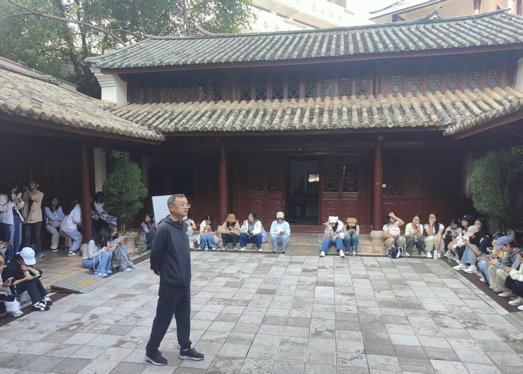 在云南大学至公堂(贡院)前,冯老师指着青石台阶讲述“云南官立农业学堂”的办学渊源:1907年,叶尔恺将森林学堂与蚕桑学堂合并,成立“云南官立农业学堂”,迁入贡院,一直办学至1922年。他将“耕读传家”的教育基因与闻一多先生的爱国精神相结合,勉励学生胸怀家国、立弘大志愿;师生们走进朱德故居,追忆1912年,朱德元帅曾任学校体操教习,写下‘投笔从戎去,刷新旧国风’,同学们齐声诵读这首《投笔从戎》,在青石板路间感受革命先辈的理想情怀。